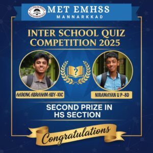 We proudly congratulate Aarone Abraham Aby (10-C) and Niramayan U.P (8-D) for securing Second Prize in the HS Section of the Interschool Quiz Competition 2025. β¨π