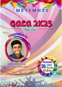 MET KIDS FEST GLA 2K23 WAS HELD ON 30TH NOVEMBER 2023.FLOWERS TOP SINGER SEASON 2 MEGA FINALIST MASTER SRIHARI NM WAS THE CHEIF GUEST .MET PRESIDENT MURALIKUMAR C PRESIDED OVER THE FUNCTION ,PRINCIPAL DR AJAY VA DELIVERED THE WELCOME ADDRESS ,DIRECTOR BOARD MEMBERS ,PTA PRESIDENT FALICITATED THE FUNCTION VOTE OF THANKS WAS PROPOSED BY ROHINI NK VICE PRINCIPAL .THE FUNCTION WAS MADE COLOURFUL BY THE VARIETY ENTERTAINMENTS BY KG AND LP STUDENTS.