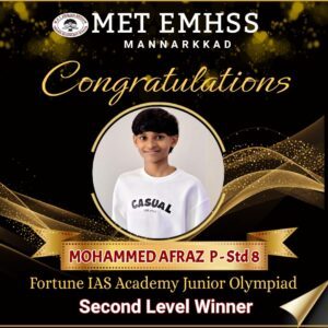 We are delighted to announce that students of METEMHSS Mannarkkad have excelled in the Fortune IAS Academy Junior Olympiad, with our talented achiever emerging as a Second Level Winner! ππβ¨